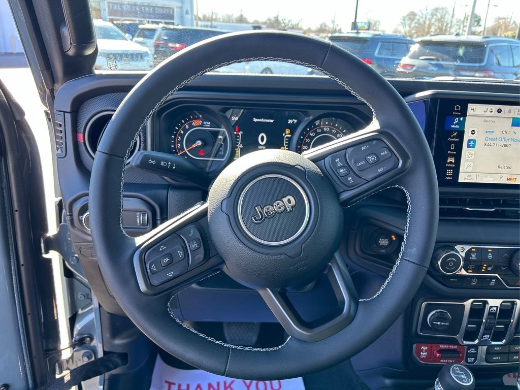 The rear parking assist technology on the vehicle will put you at ease when reversing. The system alerts you as you get closer to an obstruction. Protect this 2025 Jeep Wrangler from unwanted accidents with a cutting edge backup camera system. This model features a hands-free Bluetooth® phone system. Keep your hands warm all winter with a heated steering wheel in this unit . An off-road package is installed on this Jeep Wrangler so you are ready for your four-wheeling best. This unit's Forward Collision Warning system alerts the driver to potential front-end collisions, enhancing safety. This model keeps you comfortable with Auto Climate. The Jeep Wrangler offers Apple CarPlay for seamless connectivity. The vehicle has automated speed control that adjusts to maintain a safe following distance, enhancing highway driving convenience. The leather seats in it are a must for buyers looking for comfort, durability, and style. It comes equipped with Android Auto for seamless smartphone integration on the road.