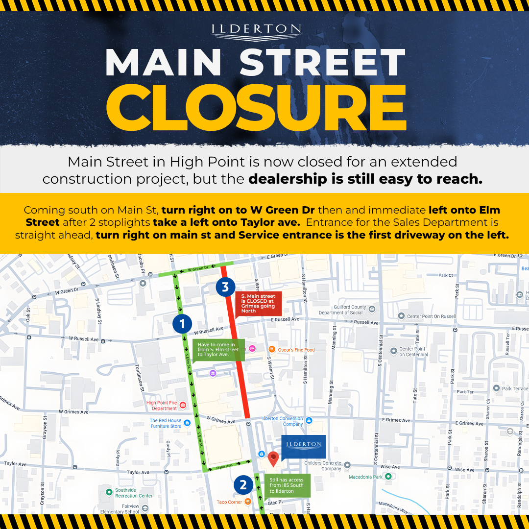 Notice: Main Street in High Point is temporarily closed for an extended construction project. Ilderton Chrysler Dodge Jeep Ram is still easy to reach — follow the simple detour below to get to our Sales and Service departments without trouble.