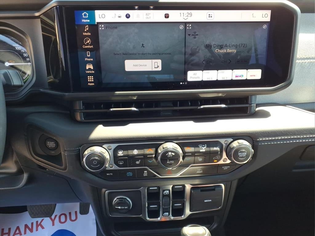 The installed navigation system will keep you on the right path. The vehicle offers Automatic Climate Control for personalized comfort. This unit offers Android Auto for seamless smartphone integration. Our dealership has already run the CARFAX report and it is clean. A clean CARFAX is a great asset for resale value in the future. An off-road package is equipped on the vehicle. Good News! This certified CARFAX 1-owner vehicle has only had one owner before you. It has automated speed control that adjusts to maintain a safe following distance, enhancing highway driving convenience. This vehicle's Forward Collision Warning system alerts the driver to potential front-end collisions, enhancing safety. This vehicle offers Apple CarPlay for seamless connectivity. Nothing dresses up a vehicle better than a set of high end premium wheels. The leather seats are soft and supportive on this 2025 Jeep Wrangler 4xe . Start this model from inside with remote start.